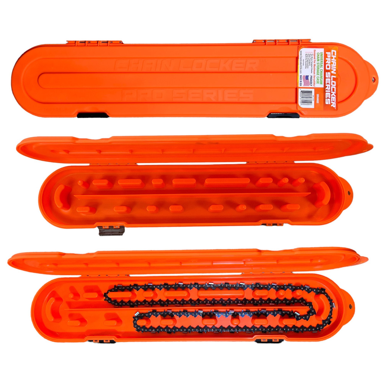 Chainsaw chain lockers are durably built to handle the rigors of transport and exposure to harsh outdoor environments. Tough polypropylene withstands rugged use and won’t corrode due to dampness. Hinges are frame reinforced and made with 1/8†diameter stainless steel rods for rust resistance. High visibility blaze orange makes the case easy to see. Proudly manufactured in the USA. Chains shown in photos not included.