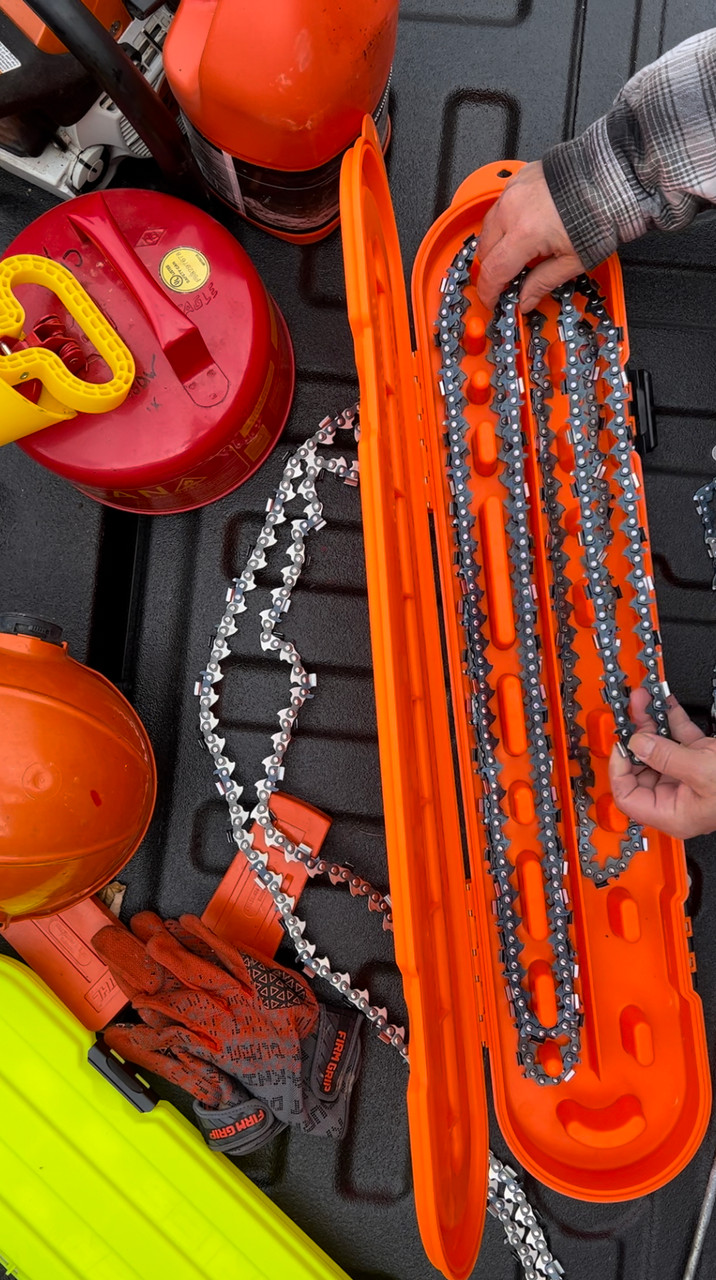 Transporting and storing chainsaw chains has never been easier thanks to the Chainsaw Chain Locker Pro Series. The Pro Series is designed to handle longer, heavy-duty chains used by professional arborists and loggers. Notches in the interior give you the option to store any chain length from 12†to 60†with a .404 pitch or smaller. Chains are snugly held in place, so they won’t slip out and become tangled.